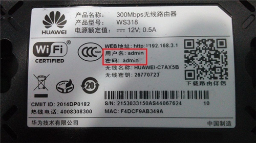 溫馨提示:華為WS318路由器默認登錄密碼是:admin,可以在底部銘牌中查看到,如下圖所示。