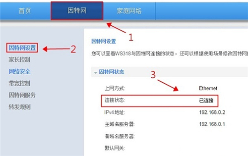 8、檢查設置是否成功,點擊“因特網”——>“因特網設置”——>查看右側的“因特網狀態”選項下的“連接狀態”,如果顯示:已連接,說明華為WS318路由器連接Internet設置成功,可以正常上網了。