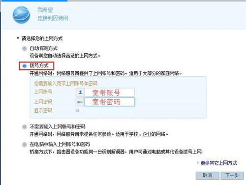 ④在電腦中輸入上網(wǎng)賬號(hào)和密碼:這種方式幾乎用不到,所以可以忽略此選項(xiàng)。