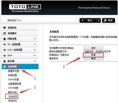 2、點擊“系統管理”——>“系統配置”——>繼續點擊右側的“恢復”按鈕,如下圖所示。