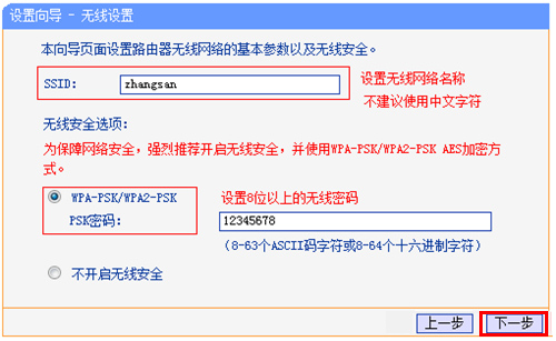 8、配置無線網絡:“SSID”即無線網絡名稱,用戶根據自己的需求進行設置——>勾選“ WPA-PSK/WPA2-PSK”——>設置“PSK密碼”——>點擊“下一步”。