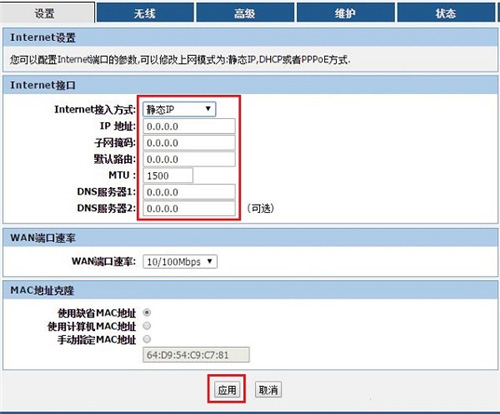如果辦理寬帶業務后,寬帶運營商給你提供了一個靜態IP地址、子網掩碼、網關、DNS地址;并且在未使用路由器時,需要在電腦本地連接(以太網)中,填寫靜態IP地址信息,然后電腦就能上網。那么在設置R3200路由器上網時,“Internet連接類型”就應該選擇:靜態IP——>填寫寬帶運營商提供的“IP地址”、“子網掩碼”、“默認路由”(也就是網關)、“DNS”——>點擊“應用”。