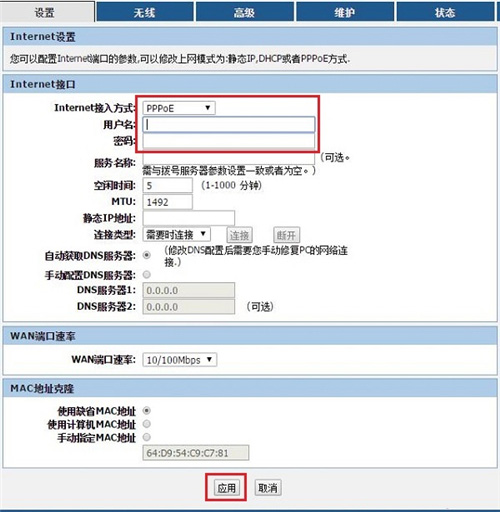 如果辦理寬帶寬帶業務后,寬帶運營商提供了 寬帶賬號、寬帶密碼給你,并且在未使用路由器的時候,電腦上需要用“寬帶連接”(或者類似的撥號程序),填寫寬帶賬號、密碼進行撥號上網。那么在設置R3200路由器上網時,“Internet接入方式”就應該選擇:PPPoE——>“用戶名”填寫寬帶運營商提供的:寬帶賬號——>“密碼”填寫寬帶運營商提供的:寬帶密碼——>點擊頁面下方的“應用”。