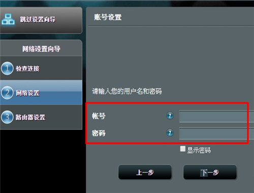 7、此時(shí)華碩路由器會(huì)自動(dòng)檢測(cè)你的網(wǎng)絡(luò)連接類型,如果見到你的寬帶連接類型是:PPPoE類型,會(huì)出現(xiàn)下圖所示頁(yè)面。請(qǐng)?jiān)凇皫ぬ?hào)”選擇中填寫:寬帶賬號(hào)——>在“密碼”中天填寫:寬帶密碼——>點(diǎn)擊“下一步”。
