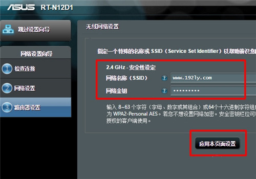 8、設(shè)置這臺(tái)華碩路由器上的無線名稱、無線密碼,然后點(diǎn)擊“應(yīng)用本頁(yè)面設(shè)置”。