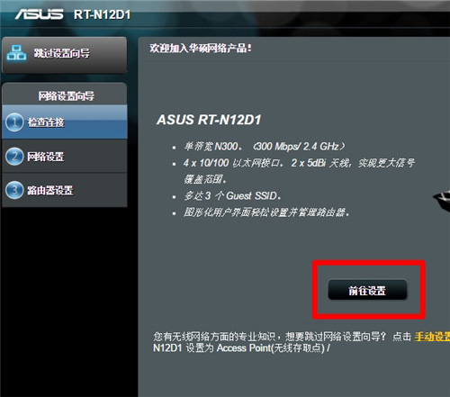 溫馨提示:某些型號(hào)的華碩路由器,會(huì)出現(xiàn)如下所示的頁(yè)面,請(qǐng)點(diǎn)擊“自動(dòng)設(shè)置”,如下圖所示。