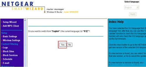 3、剛進入管理界面時它會問是否需要將英文改為中文,點擊“YES”。(WNR2000 支持多國語言包,在右上角可以進行選擇)