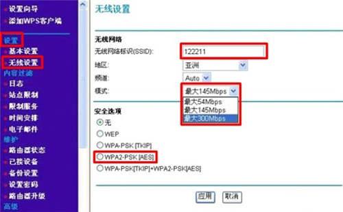 點擊“設置”——>“無線設置”——>設置“無線網絡標識(SSID)”——>“模式”選擇:最大300Mbps——>選擇“WPA2-PSK[AES]”——>設置“密碼”——>點擊“應用”