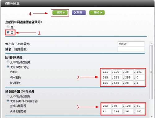 選擇菜單“設置”——>“基本設置”——>“您的因特網連接需要登錄嗎”選擇:否——>“因特網IP地址”選擇:使用靜態IP地址;然后填寫:寬帶運營商提供的IP地址、IP子網掩碼、網關IP地址——>“域名服務器(DNS)地址”選擇:使用下面的DNS服務器;然后填寫寬帶運營商提供的DNS服務器地址——>點擊“應用”如下圖: