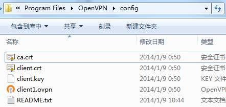我們需要將這4個文件復制或移動到OpenVPN軟件對應的目錄下。在第一步的安裝過程中,我們將OpenVPN安裝到了“C:/Program Files/OpenVPN”,因此,我們將這4個文件復制到“C:/Program Files/OpenVPN/config”文件夾下。