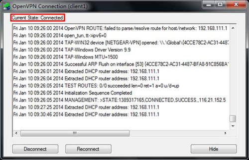 ①通過OpenVPN軟件查看:鼠標懸停在通知區域的OpenVPN圖標上可看到下圖中的信息: