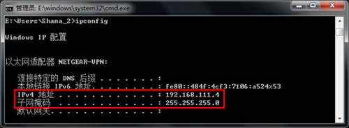 14、點擊開始菜單>運行,或在桌面空白處點擊鼠標左鍵然后按下組合鍵Win(Windows徽標鍵,一般位于Ctrl和Alt之間)+R,在彈出的窗口中輸入CMD并回車即可打開命令提示符。輸入“ipconfig”并回車執行,然后從結果中找到名為“NETGEAR-VPN”的網絡適配器并查看信息: