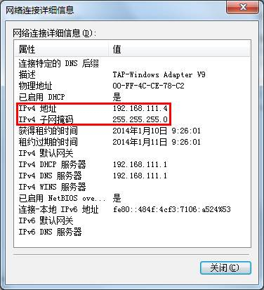 ③查看TAP-Windows Adapter V9網絡適配器狀態:與上文第五步類似,找到已經被重命名為“NETGEAR-VPN”的圖標,點擊鼠標右鍵選擇狀態,在彈出的窗口中點擊“詳細信息”(適用于Windows 8、7、Vista)或“支持”>“詳細信息”(適用于Windows XP)。從下圖中可以看到,我們已經獲取到了與遠端的NETGEAR R7000路由器同樣網段的IP地址。