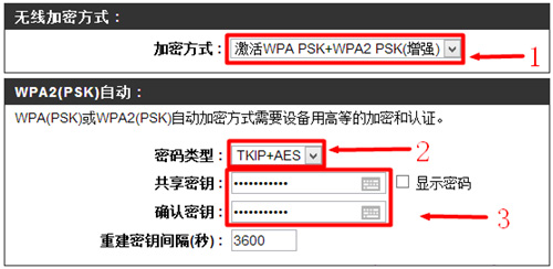 3、在右側界面中找到“無線加密方式”設置選項——>“加密方式”選擇:激活WPA/PSK+WPA2/PSK(增強)——>“密碼類型”選擇:TKIP+AES——>“共享密鑰”用戶自定義設置(PS:共享密鑰就是無線WiFi的密碼)——>“確認密鑰”后面再次輸入剛才在“共享密鑰”后面設置的密碼。