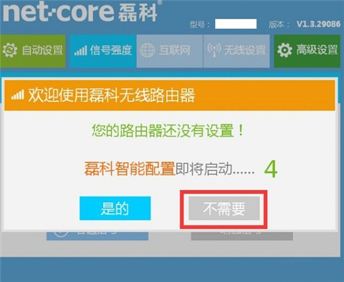 4、如果是第一次配置磊科NW719路由器,這時候會自動彈出“磊科智能配置”選項,這里請選擇:不需要。