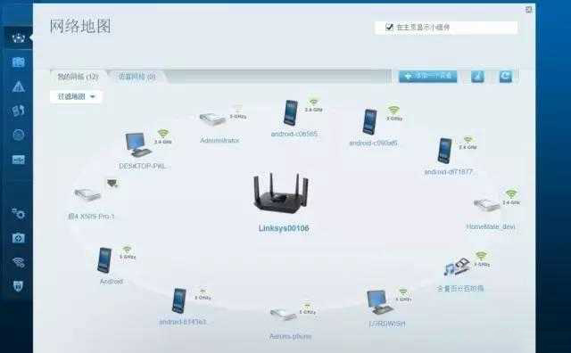 WEB端管理頁面與手機APP的差異主要有四個地方,一是加入了網絡地圖的功能,以圖標的形式來直觀的顯示當前的連接設備類型,同時可以快速的通過篩選不同類型的設備進行管理,同時可以標識出當前的聯網方式以及對應的WiFi信號強度。