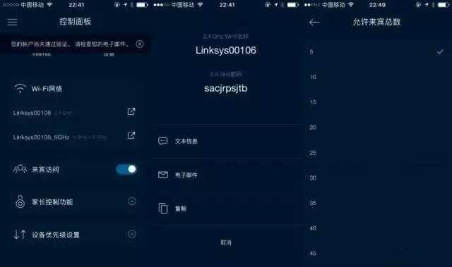 在APP端,可以快速查看或是分享當前WiFi網絡的密碼,免去了進入WiFi設置查看密碼的麻煩。對于這個默認開啟的來賓帳號,雖然最多可以支持50人的接入,但是如果你家里沒有那么多客人經常來的話,建議直接關閉。