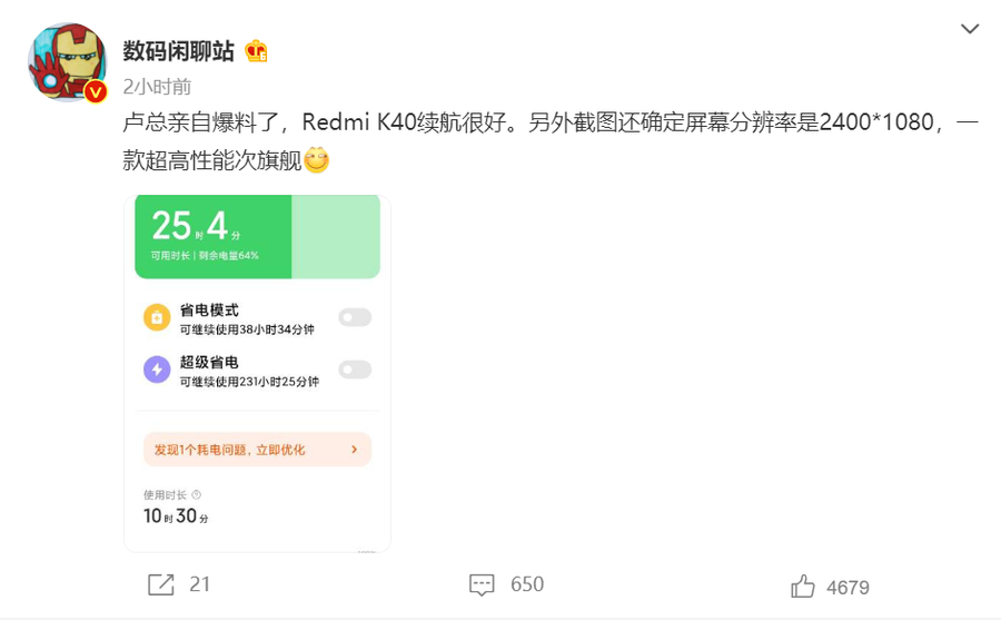 盧偉冰曬出Redmi K40續航截圖