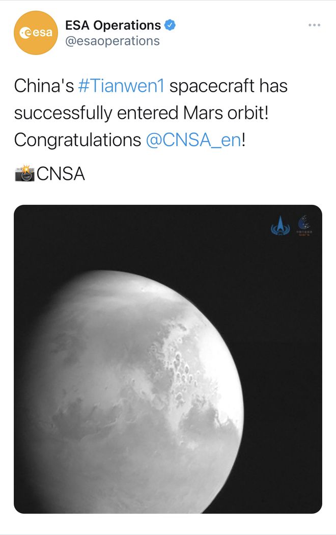 歐航局祝賀“天問一號”探測器順利