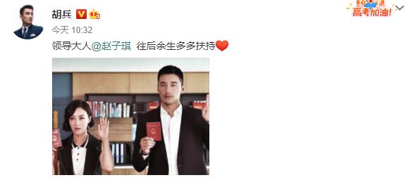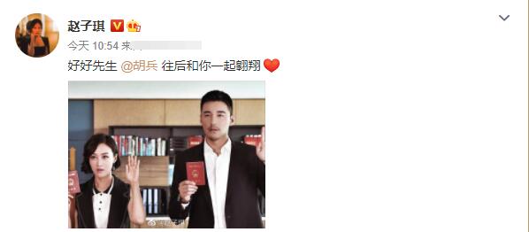 胡兵趙子琪曬手持結婚證宣誓劇照引