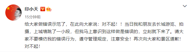 印小天就“長城城墻上跳舞”道歉:給