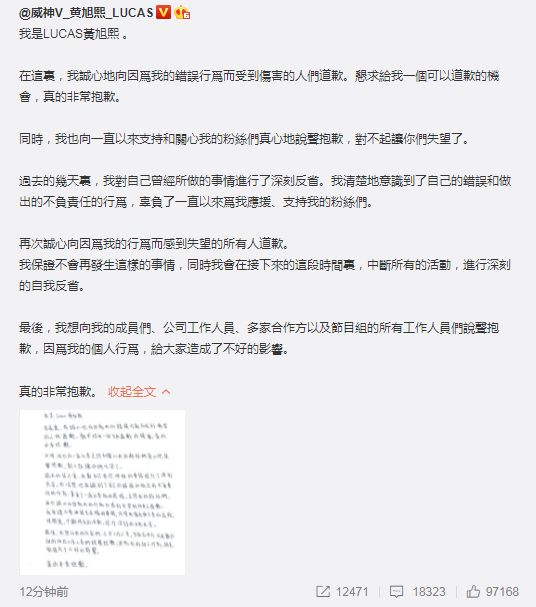 黃旭熙手寫信道歉宣布暫停工作 到