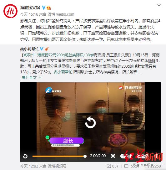 海底撈回應(yīng)72元200g毛肚只有138g:顧