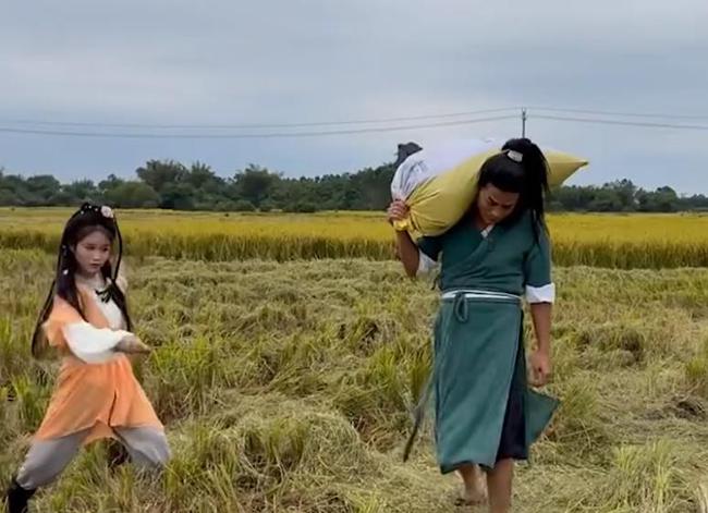 “夫妻裝扮成郭靖黃蓉收稻谷”視頻