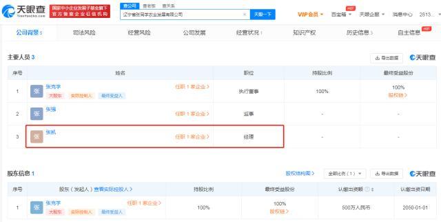 天眼查App顯示,12月10日,疑似“張同學”關聯公司遼寧省張同學農業發展有限公司成立。該公司注冊資本500萬人民幣,注冊地址為遼寧省營口市大石橋市建一鎮松樹村,法定代表人為張克學,經營范圍包括食用菌菌種生產;主要農作物種子生產;旅游業務;農副產品銷售;食品互聯網銷售等。該公司由張克學全資持股并擔任執行董事,張凱擔任經理,張強擔任監事。
