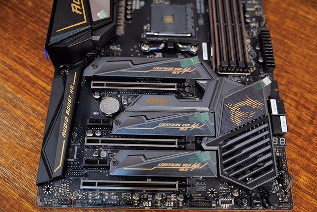 主板上擁有三根PCIe x16槽,并且通過金屬加固,靠近CPU插槽的為X16,其他兩條為X8,主板上板載了三個M.2接口,均為PCIe4.0,并配備了M.2冰霜鎧甲,有利于M.2固態(tài)更好的散熱,做工用料還是非常不錯的。X570主板PCH溫度相對要高,一般會配備一個小風(fēng)扇輔助散熱,唯一不足的是有了風(fēng)扇就避免不了積灰與噪音的問題。