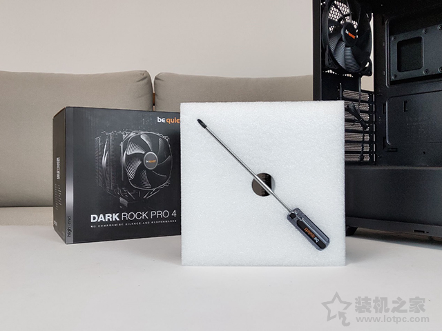 打開包裝后可以看到被泡沫包裹嚴實的Dark Rock Pro 4散熱器本體,取出后意外的發現在泡沫側面還貼心的附贈了一個帶有磁性的螺絲刀,一個小小的驚喜。