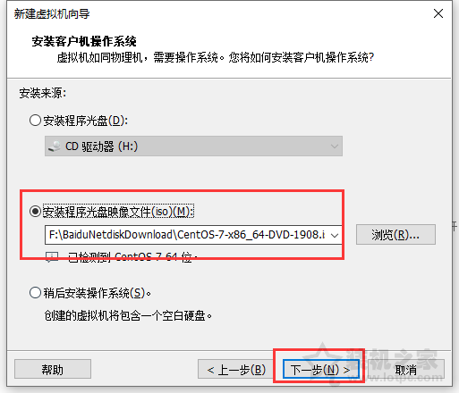 3、點選“安裝程序光盤映像文件”,選擇我們的CentOS-7-x86_64-DVD-1908.iso鏡像文件,然后單擊“下一步”