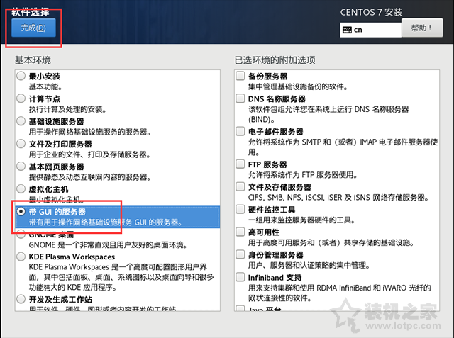 11、根據自己需求來選擇安裝哦!我們這里是勾選“帶GUI的服務器”,當然如果你覺得沒有桌面也行,直接默認“最小安裝”即可,點擊“完成”按鈕。
