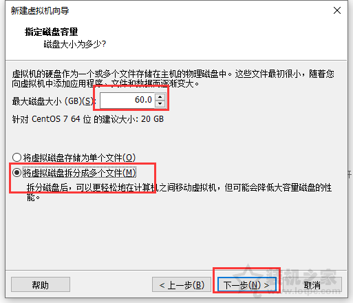 5、我們設置硬盤磁盤容量,也就是分配給這臺虛擬機的硬盤容量,例如60G,并點選“將虛擬磁盤拆分成多個文件”,并點擊“下一步”。