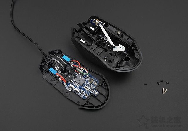 拆開外殼就能看到鼠標內部的PCB板,鼠標的五臟六腑都在上面,非常密集。最中央的是光學引擎也就是傳感器(Sensor),滾輪依靠編碼器,兩邊是左右鍵的微動開關,