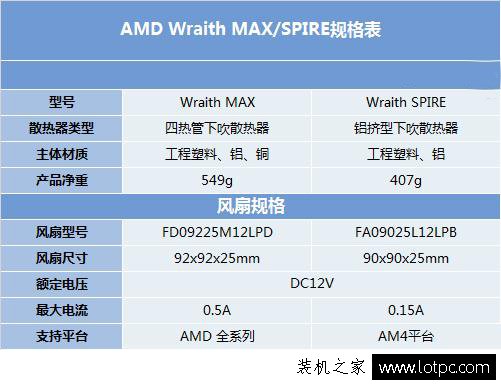 在規格方面,二者的差異如表所示。除了結構有差別之外,它們對平臺的支持也不同。Wraith MAX支持AMD全平臺,這意味著老款推土機平臺也可以使用它。而Wraith SPIRE則僅適用于AM4平臺,它是銳龍CPU的專用散熱器。