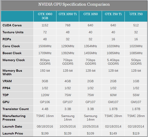 核心方面,GTX 1050基于Pascal核心GP107-300,主頻1354MHz,加速頻率1455MHz,FP32單浮點精度1.8TFLOPs,1050 Ti基于GP107-400,主頻1290MHz,加速頻率1392MHz,FP32單浮點精度2.1TFLOP,按照權威媒體Anand的說法,這次換用了14nm FinFET工藝,官方未透露,但三星可能性最大。