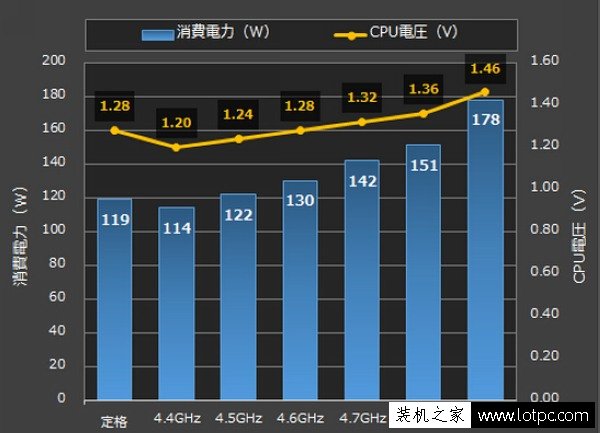 溫度表現與CPU電壓的運行趨勢圖可以看出,手動4.4G降電壓后溫度和默頻持平,這個算是個小竅門吧。然后,隨著電壓陸續0.4V的提升,溫度也呈現了遞增,其中4.8G到4.9G的溫度變化最大,因此我們建議還是將I7 6700K超頻至4.8G比較妥當。