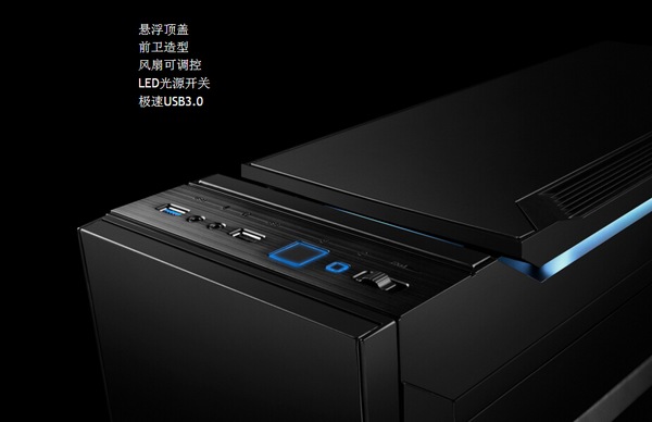 頂部的情況如下:I/O擴(kuò)展豐富,前衛(wèi)造型,包括風(fēng)扇可調(diào)控制器,LED背光燈開關(guān),USB3.0,耳麥插槽、開機(jī)和重啟按鍵(帶燈圈)。