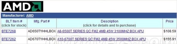 通過美國網店ShopBLT上可以看到A10-6700T,A8-6500T的身影,報價分別是155.91 usd、108.59 usd。也就是大概折合人名幣950元、665元價格,一般預定報價都是虛標的,不過最終上市的報價一定會便宜很多。