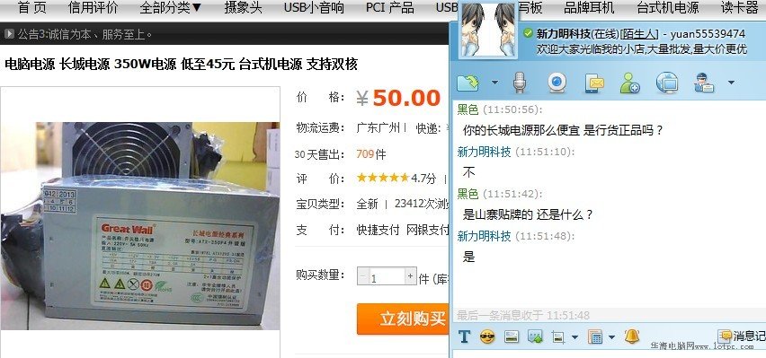 于是小編隨便走訪了一套月銷量不錯的淘寶店面,小編詢問了長城電源那么便宜 是行貨正品嗎?有的商家很誠實并承認自己的產品屬于山寨貼牌的,但是也有商家欺騙的說是行貨的。oem的,又說是香港臺灣水貨等,其實都是翻新貼牌的電子產品,電源只是一部分,還有一些衣服商品,貼著什么美特斯邦威等商標再進行出售。這樣的網購實在讓人擔心!