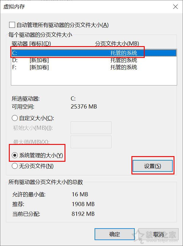將每個盤設置為“系統托管的大小”,并且點擊“設置”按鈕,將每個盤設置好托管的系統之后,點擊確定按鈕。或者嘗試一下直接勾選“自動管理所有驅動器的分頁文件大小”,點擊確定。