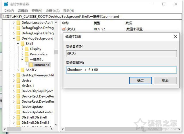 6、點選“command”項,雙擊右側欄中的“默認”,在數值數據處輸入 “Shutdown -s -f -t 00”,點擊確定。