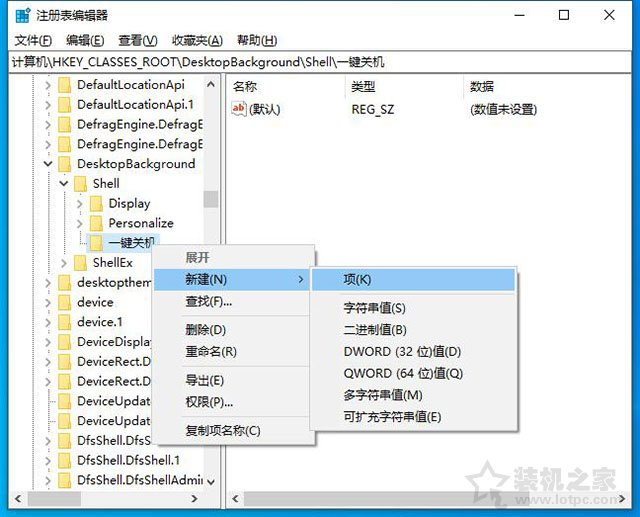 5、鼠標右鍵點擊“一鍵關機”項,選擇新建,選擇項,將新建的項命名為【command】。