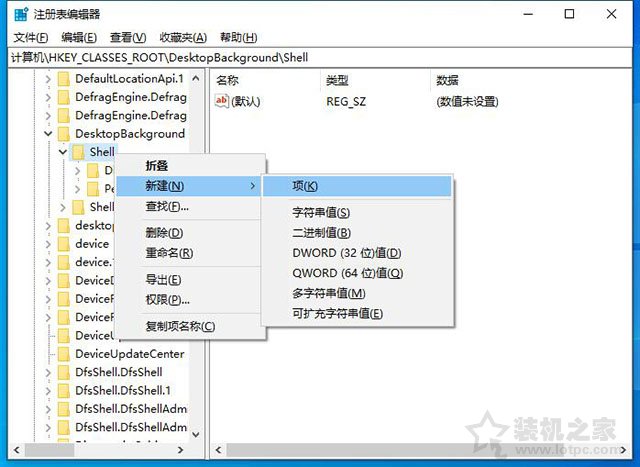 2、鼠標右鍵“shell”項,選擇新建,選擇項。