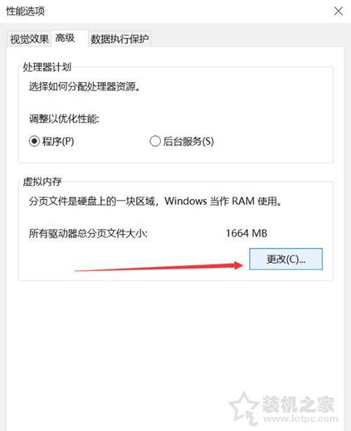 5、在性能選項(xiàng)界面中,我們切換至“高級(jí)”的選項(xiàng)卡中,并點(diǎn)擊“更改”按鈕,如下圖所示。