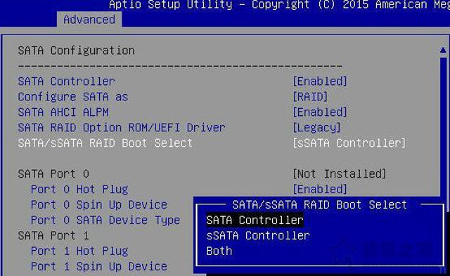3、主板SATA口有兩個芯片,分別是SATA和sSATA,如果您硬盤是接到SATA接口上的,將SATA/sSATA RAID Boot Select的選項修改為“SATA Controller”,調整好之后按F4保存設置,如下圖所示。