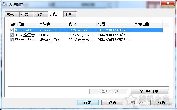 3、再切換到啟動選項卡,把其中不必要的啟動項全部打勾,點擊右下角的全部禁用,確認之后,重新啟動win7系統即可,如下圖所示: