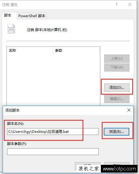 在注銷屬性窗口,點擊“添加”然后點擊“瀏覽”,找到剛才建好的桌面上的“垃圾清理.bat”,再點“確定”。