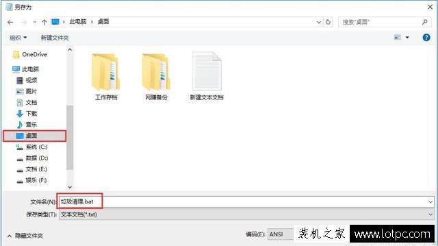 依次點擊記事本左上角的文件-另存為,在彈出的窗口將保存位置選擇桌面,文件名改為:垃圾清理.bat 然后保存,就會在桌面產生一個垃圾清理.bat程序。